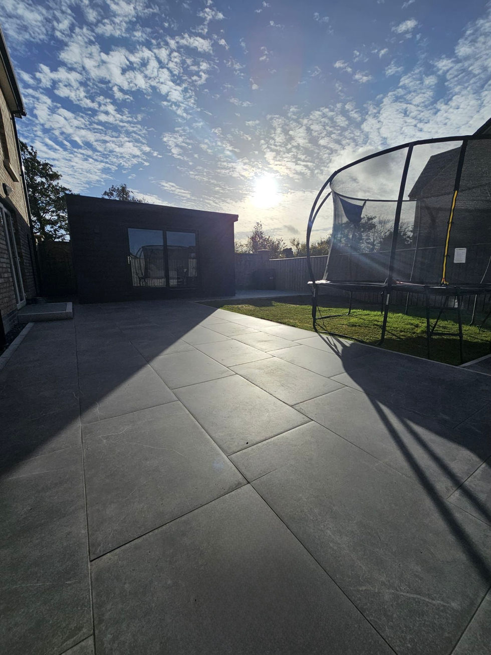 A showcase of modern white houses with spacious patios and gardens, perfect for outdoor living.